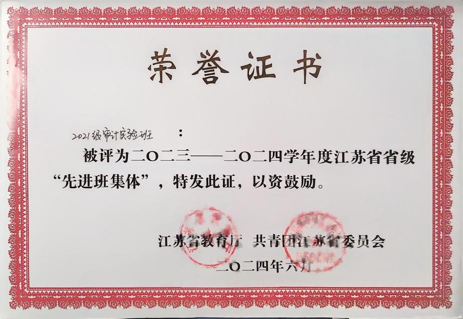 截至发稿前,2021级审计实验班累计发展了6名中共党员、11名发展对象、12名入党积极分子;2024年度被评为江苏省省级“先进班集体”,并多次获得校“优秀班级”和“优良班风班”,所在团支部也获得了“先进团支部”和“五四红旗团支部”;更涌现出“省级三好学生”“优秀团员”“大学生时代新人”等众多先进典型。