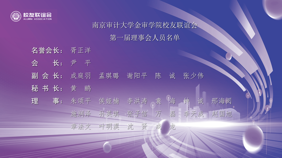 金审学院党委委员、校长助理成庭羽宣读第一届校友联谊会理事会人员名单。