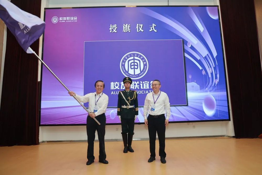 南京审计大学党委常委、副校长任志成向校友联谊会会长尹平授旗