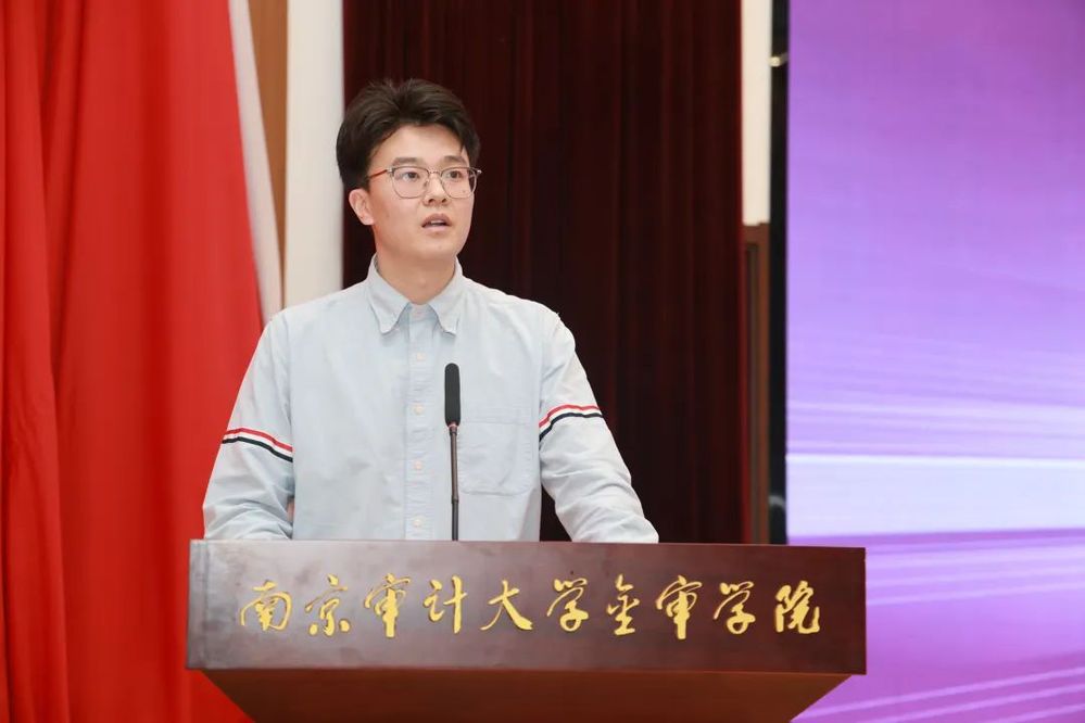 中国石油中油资本昆仑保险经纪股份有限公司江苏分公司负责人、保险2015级校友邢海阅发言。他深情回顾了在金审求学的四年时光和收获,并向学弟学妹们分享了三点心得:一是要终身学习,既要更新知识,更要提升沟通与应变能力;二是要坚守梦想,将挫折化为成长的阶梯;三是要心怀感恩,以经验反哺母校,传承金审精神。他表示,未来将通过校企合作、校友奖学金等机制深化联结,携手同行,为母校增添荣光。