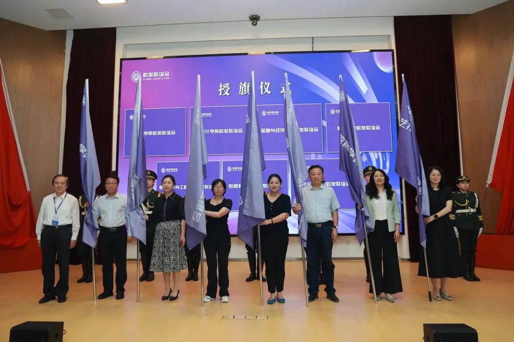 校友联谊会会长尹平向各二级学院校友联谊会授旗