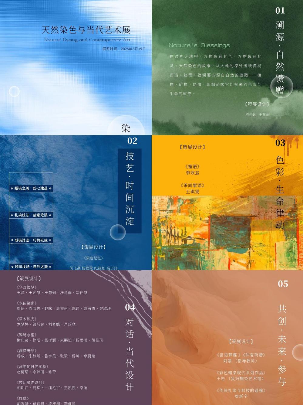 展览现场,可以看到五大主题板块层层递进,第一板块【溯源·自然馈赠】以苏木、虎杖等染料植物标本陈列为核心,追溯植物染料的天然本源;随后的【技艺·时间沉淀】通过历史文献、工艺流程解析、传统工具实物及60年代蜡染背扇等珍贵藏品,呈现传统技艺的文化积淀;步入【色彩·生命律动】展区,近300张渐变色装板揭示同种染料在不同面料上的色谱变幻;第四板块【对话·当代设计】则以同学们结合创意思维设计出装置艺术,重构植物染技艺,展现传统工艺与现代审美的跨界碰撞;最终在【共创·未来·参与】互动场域,观者既可亲手体验植物染制作,又能观摩当代蜡染艺术家的创新作品。五大主题从自然本源到人文创新,构筑起传统技艺的完整叙事链。