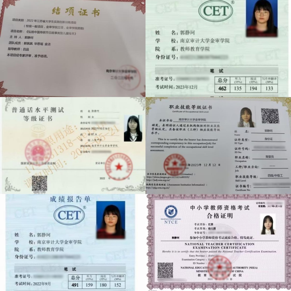 在专业课方面,郭静珂比较擅长学前教育专业美术与环创,曾在幼儿园实习期间帮助主班老师和副班老师设计自然角,参与班级内的环创设计,自然角的设计获得了园内的一等奖。在校期间,郭静珂通过了大学英语“四级考试”、“六级考试”、“江苏计算机一级考试”。获得了“普通话二级甲等证书”、“幼儿园教师资格证”、“中级育婴师证”等。