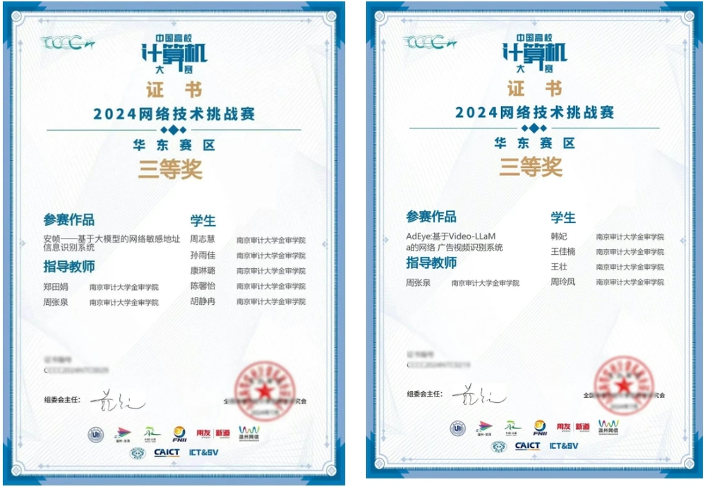 在 “中国高校计算机大赛—2024 网络技术挑战赛”中,陈馨怡、胡静冉、王佳楠、韩妃同学在比赛中沉着冷静,凭借扎实的计算机网络知识与出色的实践能力,以及优秀的专业素养与团队协作精神,攻克重重难关,荣获华东赛区三等奖 ,为班级赢得了荣誉。