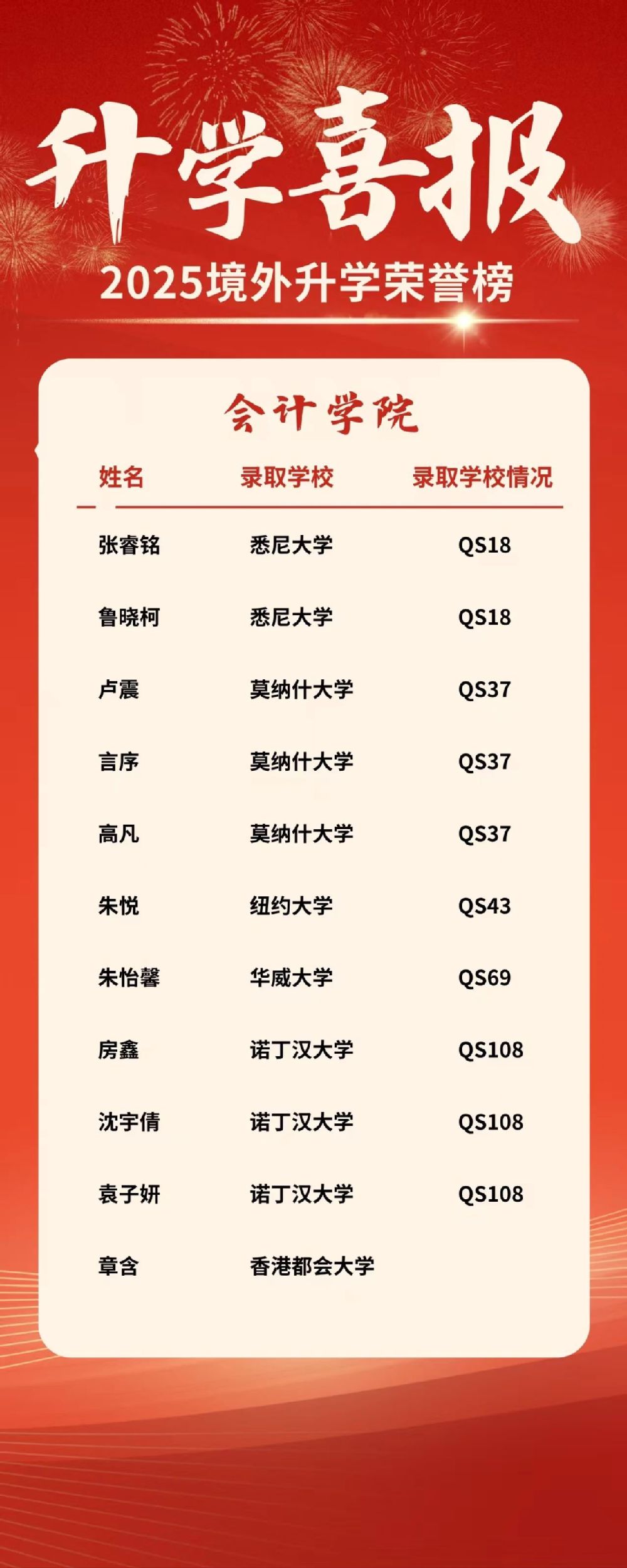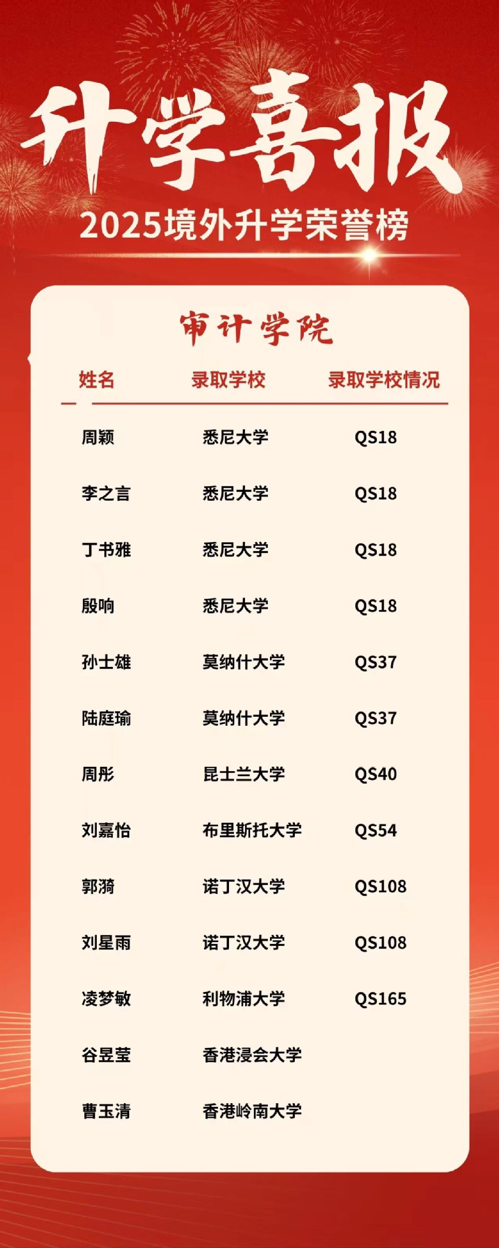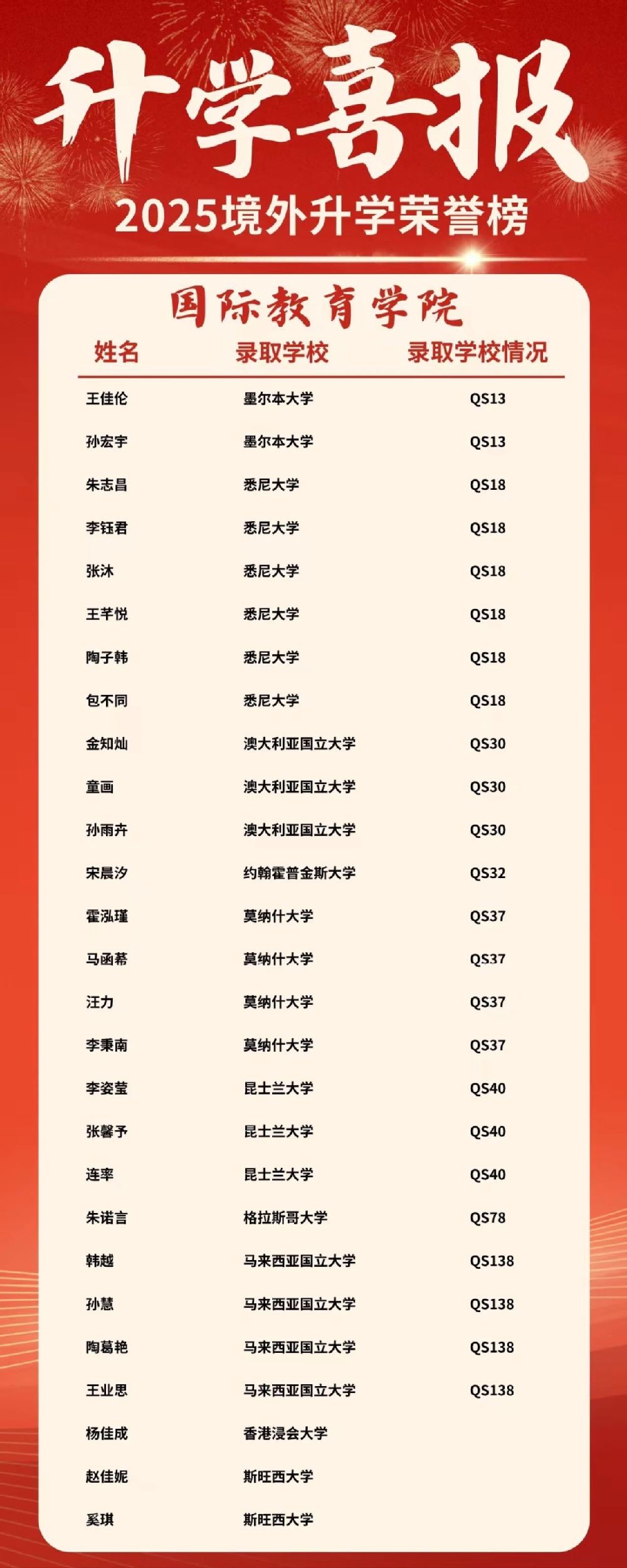 我校2025届学生境外及港澳地区升学研究生佳绩不断,截至2025年5月21日,86名同学境外及港澳地区升学研究生。其中QS排名最高13墨尔本大学录取2人,QS18悉尼大学录取17人。