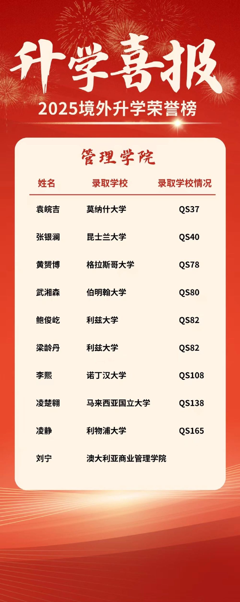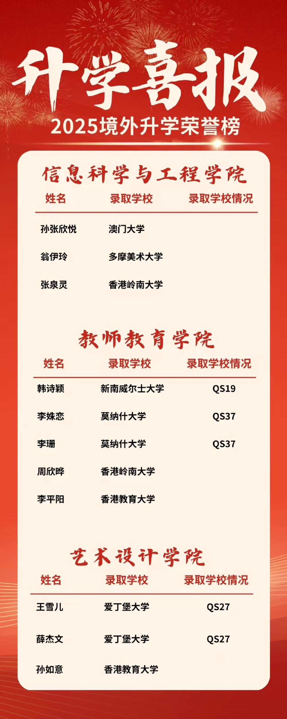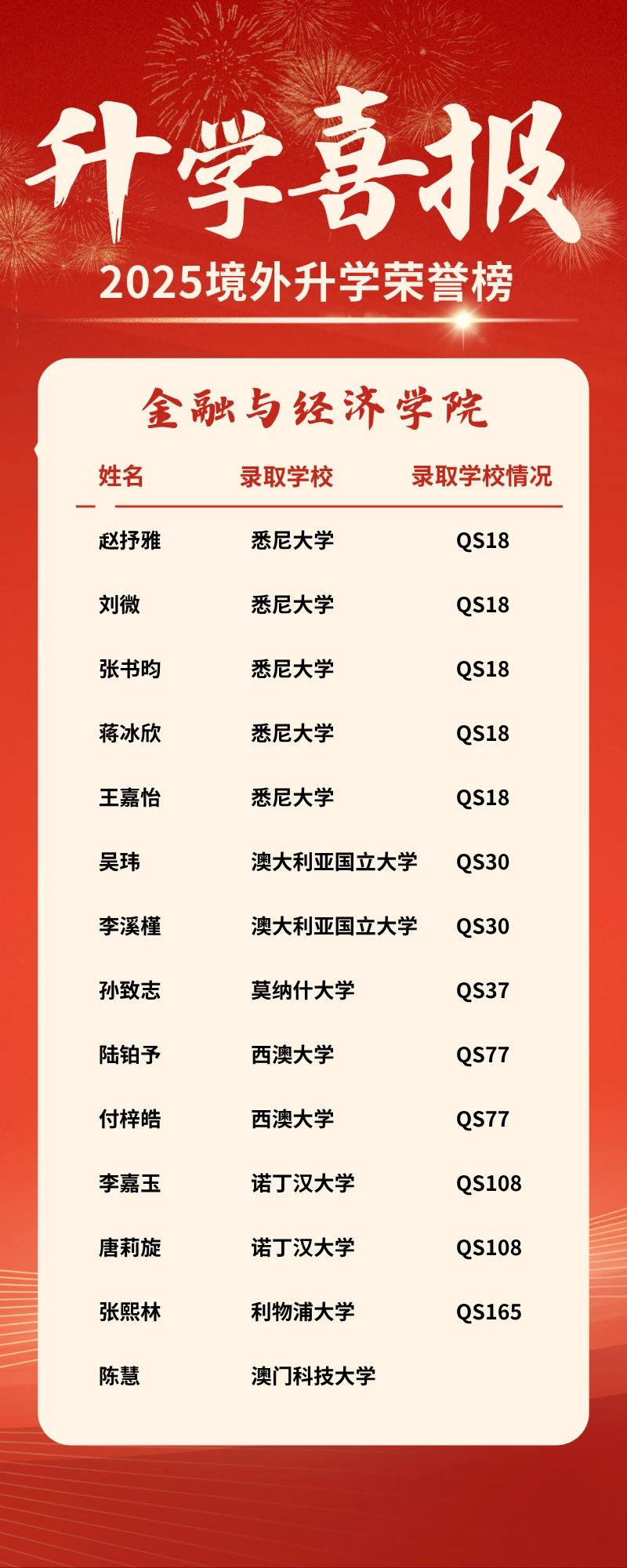我校2025届学生境外及港澳地区升学研究生佳绩不断,截至2025年5月21日,86名同学境外及港澳地区升学研究生。其中QS排名最高13墨尔本大学录取2人,QS18悉尼大学录取17人。