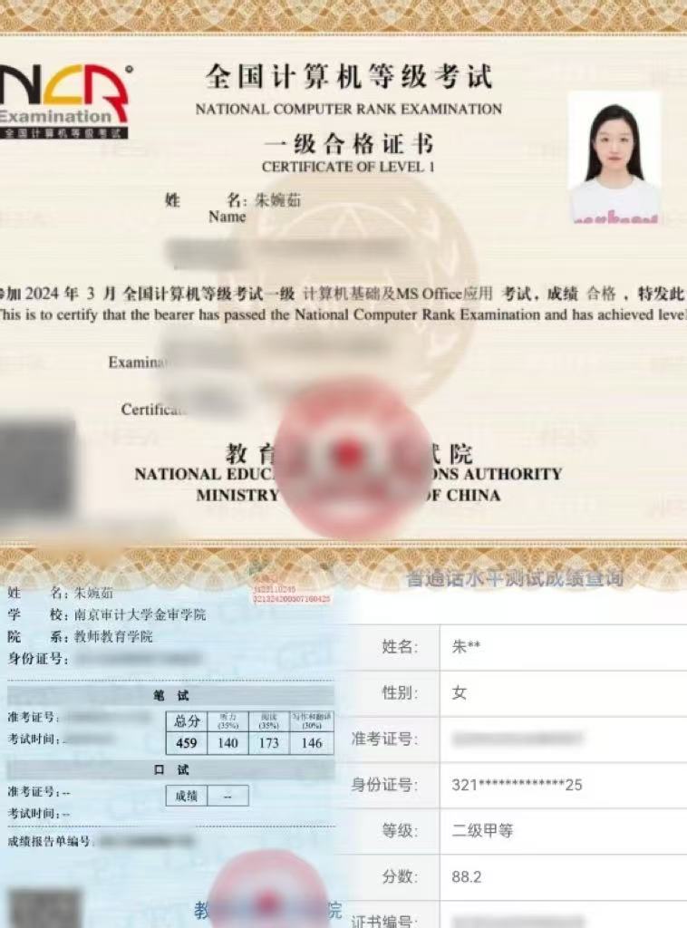 朱婉茹,女,汉族,江苏宿迁人,共青团员,教师教育学院2023级学前2班学生。在校期间,朱婉茹曾 获“校三等奖学金”、“优秀团干部”称号、“南京审计大学金审学院2025年校园‘健美操、啦啦操’大众健美操‘第一名’”。先后又通过“大学英语四级”、“计算机一级”、“普通话二级甲等”。参加了团代会第二次代表大会,在班级中担任班长一职,所在班级荣获“优秀志愿者团队”、“先进班集体”、“优良班风班”;在宿舍中担任宿舍长一职,所在宿舍连续获得“文明宿舍”称号。