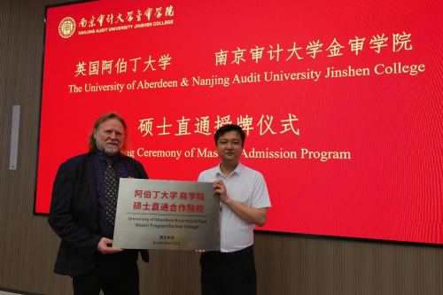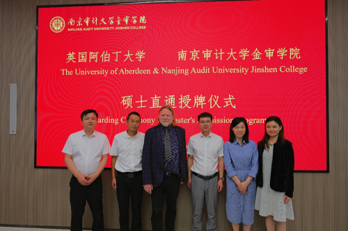 2025年6月13日上午9:30,英国阿伯丁大学与南京审计大学金审学院在行政楼一楼会议室举行了座谈交流暨硕士直通授牌仪式。此次活动旨在加强两校间的国际合作与交流,共同探索教育合作新路径。阿伯丁大学商学院院长Professor John Skåtun、副院长Dr. Joyce Chen,南京审计大学金审学院教务处处长杨新房,质量评估处副处长、教务处副处长徐洪灿,国际教育学院党总支副书记张驰以及高顿教育全球战略及合作伙伴专家樊文祺等代表参加本次座谈会。