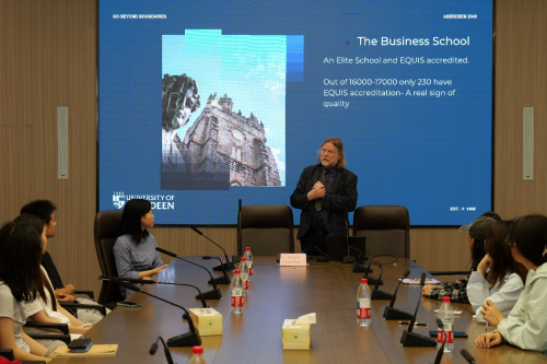 活动精心设置了学生座谈会环节。座谈会上,学生们展现出极高的参与热情,踊跃提问。他们围绕阿伯丁大学的学术环境、校园生活等方面提出了诸多疑问。Professor John Skåtun 和 Dr. Joyce Chen 不仅耐心细致地解答了学生们的每一个问题,还主动且全面地向学生们介绍了阿伯丁大学的发展历程、学科优势、教学资源以及丰富多彩的校园活动等内容,现场交流氛围热烈而融洽,双方互动良好。