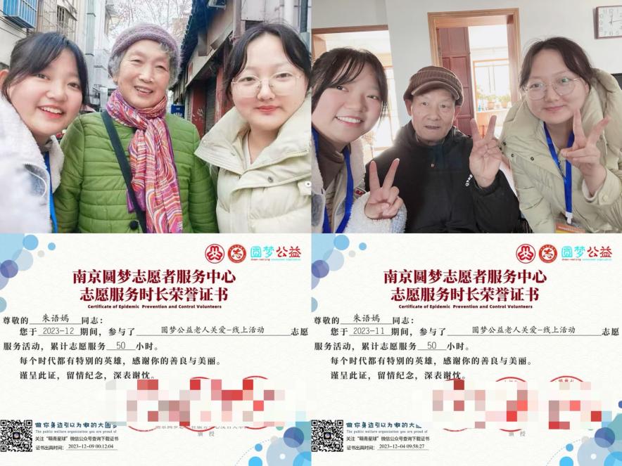 公益路上的她,总在虚实之间奔波忙碌。线上通话时,她总把课余碎片时间缝补成整块光阴,指尖在拨号键上轻跳,听筒里便漫出老人的絮絮叨叨。她笔尖在笔记本上沙沙游走,把细碎需求一一收进纸页,短短三周便织完250张声音的网,让牵挂顺着电波爬过城市的褶皱,落在每个等待的听筒旁。线下走访时,她常与伙伴们踩着晨光或暮色出门,脚印在南京的社区巷弄与乡村田埂间洇开。敲开斑驳的门扉,握住老人布满岁月痕迹的手,陪他们晒晒太阳、聊聊往事,或是搭把手做些琐事。127次叩门,127回陪伴,让真切的暖意凝成看得见的模样——是老人眼角笑出的纹路,是临别时被塞在手心的几颗糖。