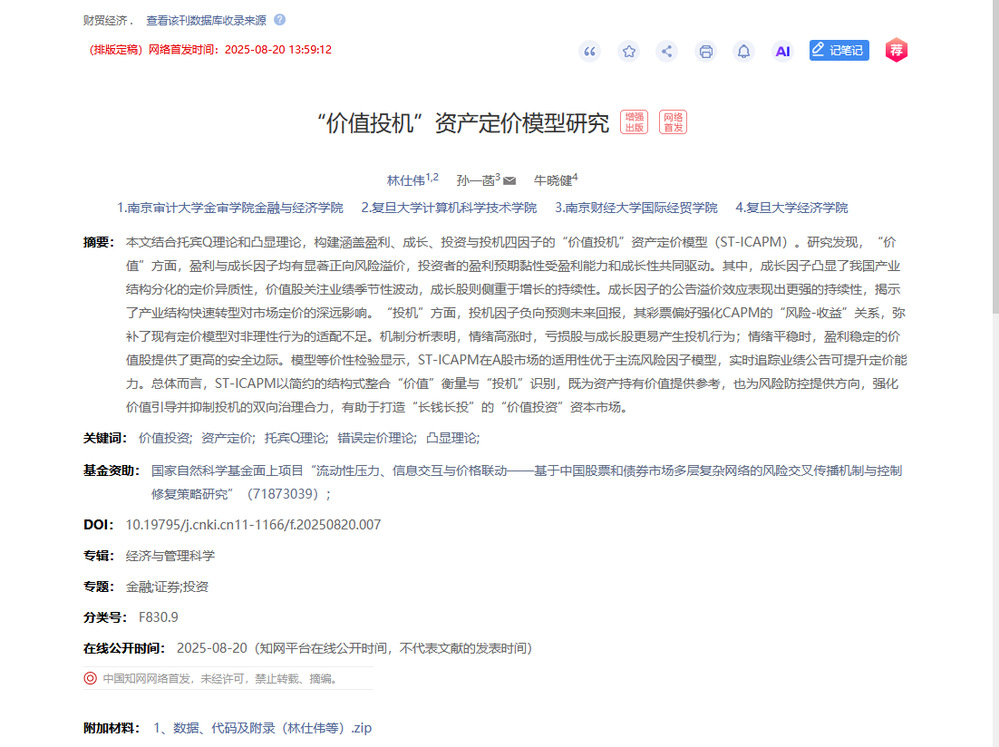近日,我校金融与经济学院林仕伟老师在教育部学科评估A类期刊《财贸经济》发表《“价值投机”资产定价模型研究》一文,该论文是我校科研成果高质量发展的体现。