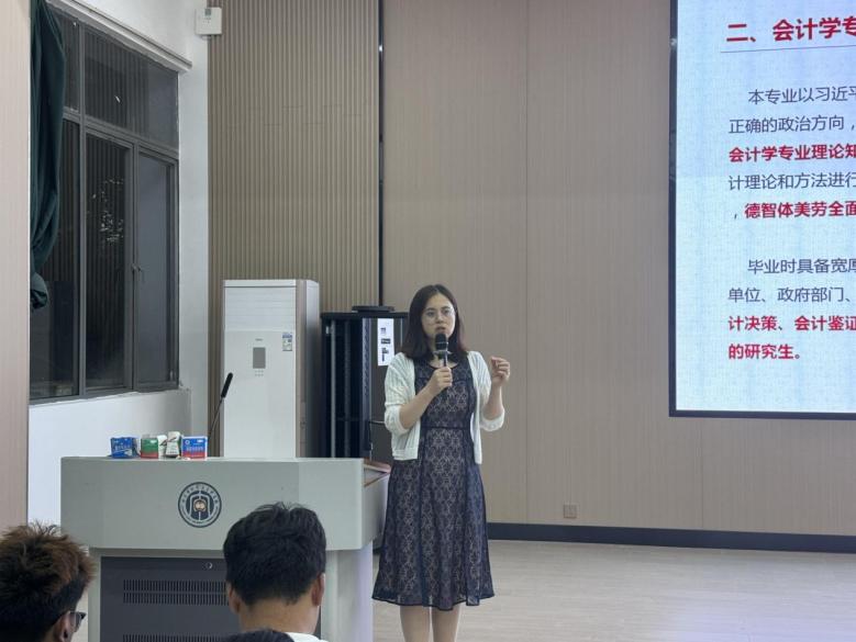 在专业培养体系解读环节,老师全面介绍了学院会计学专业的课程设置与教学资源。同时,老师分享了专业教学成果:近年来,我校会计学等专业学生在考研升学、优质就业、学术论文撰写等方面均取得亮眼成绩,进一步增强了新生的专业认同感与学习信心。针对“如何规划大学四年”这一新生关注的重点,老师也给出了各个阶段具体化的建议并重点分析了考研的准备路径。
