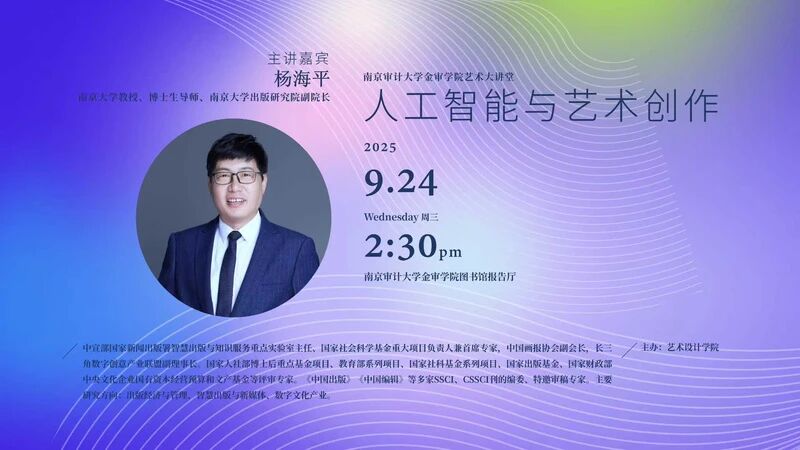 当天下午还举办了由南京信息工程大学周越教授带来的《从经典到智能:新时代视听语言的转型与挑战》的精彩讲座,以及江苏省科学与艺术创新大赛宣讲会。9月24日,展览配套活动还包括“AIGC+AR创新设计工作坊”及南京大学杨海平教授主讲的《人工智能与艺术创作》专家讲座。