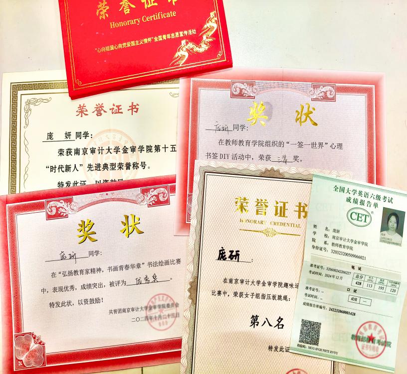 求学路上,她以热忱为笔,在成长画卷上勾勒出扎实的轨迹。她的学业成绩始终位居班级前列,如今,她已通过“全国计算机一级”、“全国大学英语六级”、“普通话二级甲等”等专业等级考试。在专业技能方面,舞蹈是流动的诗,她以肢体诉说韵律;美术是定格的梦,她用色彩晕染巧思;音乐是跳动的光,她借旋律传递暖意。生活中,她曾多次走进幼儿园见习,在孩子们的笑声里,将舞蹈的灵动、美术的童趣、音乐的温柔融入点滴,让理论知识在实践中绽放出教育的力量。