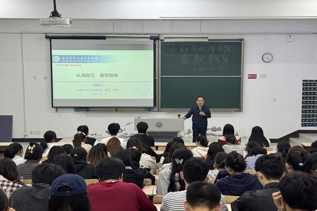 为深入落实《南京审计大学金审学院卓越人才培养行动方案》,推动“三全育人”走深走实,2025年10月15日,金融与经济学院院长蔡则祥为2023级专转本新生带来一场主题为“认清自己,奋发图强”的启航教育讲座。讲座在教学楼B中108举行,现场座无虚席,学生满怀期待,凝神聆听。