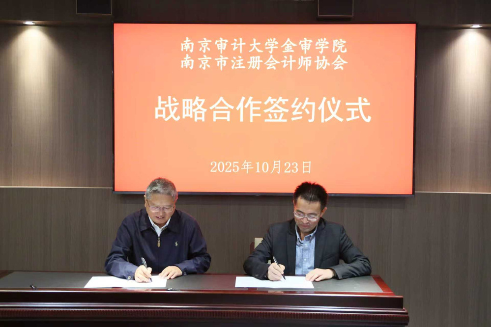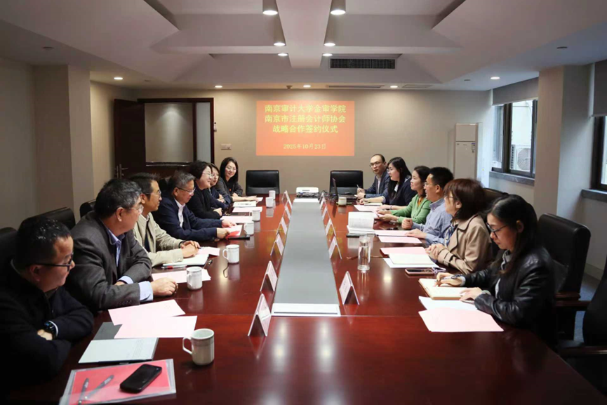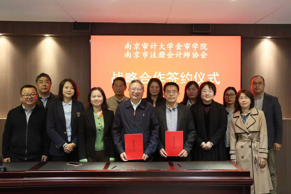 为实质性推进我校产教融合、校企合作工作,进一步提升我校应用型人才培养质量,10月23日下午,南京审计大学金审学院校长俞安平、校长助理孟琪璐、会计学院院长吴中春、审计学院院长仲怀公、党总支书记王亚娜、综合办副主任李力、教务处处长杨新房等一行赴南京市注册会计师协会开展访企拓岗暨战略合作协议签约活动。南京市注册会计师协会会长张世福、副会长常向阳、办公室主任吴向前、考试培训部主任罗艳、注册监管部主任陈玲及党建工作部主任刘文秀等出席签约活动,活动由校长助理孟琪璐主持。
