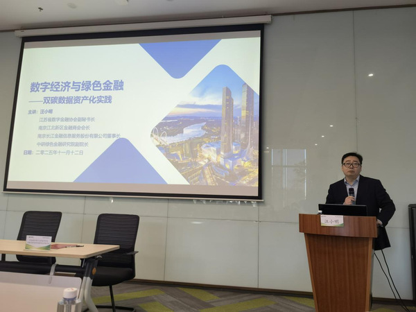 活动第二站,“绿融未来,探索新篇”绿色金融微专业系列论坛第二期在中研绿色金融研究院举行。本期论坛以“数字经济与绿色金融”为主题,特别邀请江北新区金融商会会长汪小明担任主讲嘉宾。汪会长结合自身丰富的行业实践经验与前沿研究视野,围绕数字产业化、产业数字化、业务数据化、数据业务化四大维度,结合碳数据资产开发与绿色金融创新实践,进行深度分享。汪会长指出,数字技术的迭代升级为绿色金融发展提供了全新路径,业务数据化让绿色项目的环境效益可量化、可追溯,数据业务化则推动碳数据转化为可交易的资产,两者的深度融合正在重构绿色金融的业务模式与价值逻辑。他结合江北新区绿色金融实践案例,详细解读了碳数据资产定价、绿色信贷创新、ESG 投资实践等行业热点问题,为同学们展现了绿色金融领域的广阔发展空间与职业前景。