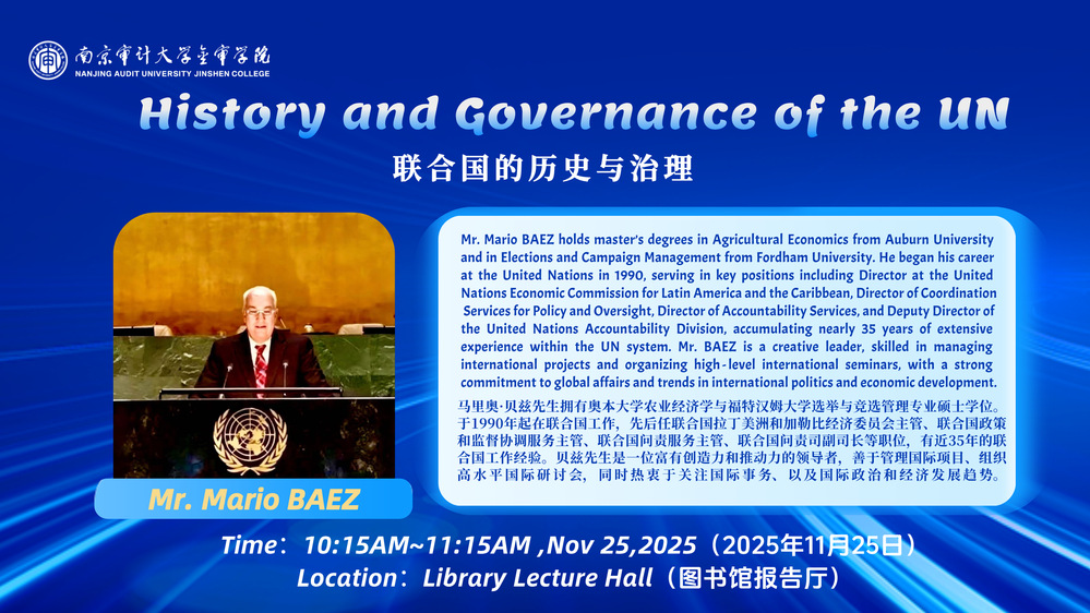 11月25日上午10时,以“联合国:历史概述与治理”为主题的专题讲座在南京审计大学金审学院图书馆报告厅顺利举行。本次活动特邀纽约市立学院兼职教授、艾德菲大学研究员马里奥·贝兹(Mario Baez)担任主讲嘉宾,马里奥·贝兹于1990年起在联合国工作,先后任联合国拉丁美洲和加勒比经济委员会主管、联合国政策和监督协调服务主管、联合国问责服务主管、联合国问责司副司长等职位,有近35年的联合国工作经验。他围绕联合国发展历程、核心职能与全球治理实践展开深度分享,为在场师生带来一场兼具理论深度与现实意义的学术盛宴。