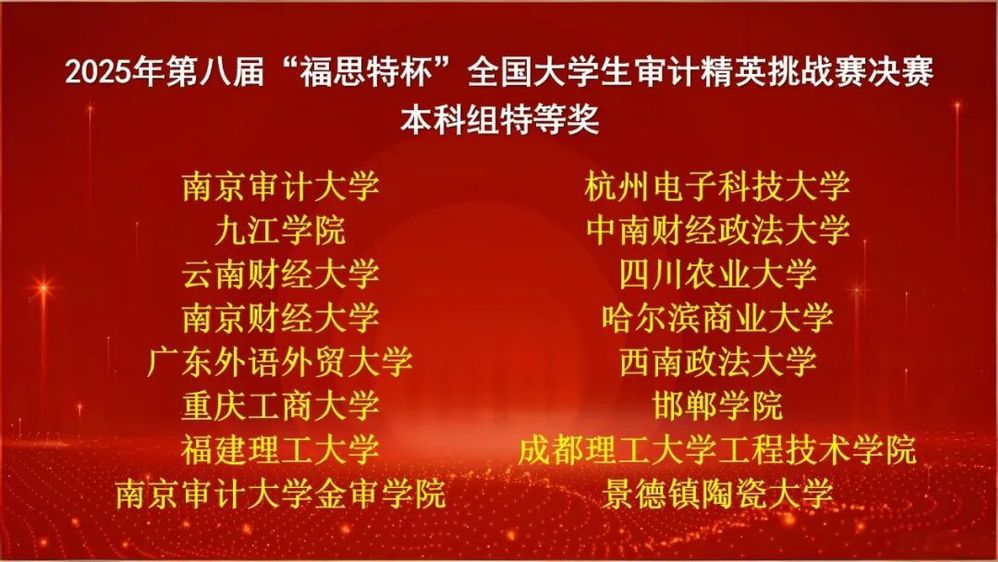 11月29日,由中国审计学会审计教育分会主办、教育部审计学课程群虚拟教研室和南京审计大学国家审计学院承办的第八届“福思特杯”全国大学生审计精英挑战赛圆满落下帷幕。我校审计学院郑子菡、温敏伽、孙淇三位同学凭借扎实的专业基础、出色的团队协作与稳定的临场发挥,成功斩获国家级特等奖,位列全国第8名!