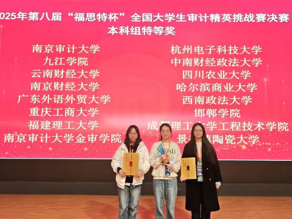 本次取得特等奖的队伍由我校2023级审计实验班郑子菡、温敏伽、孙淇三位同学组成。三位同学从校内选拔中脱颖而出,在仲怀公、马圆明、曾佳齐三位教师的指导下开展赛前训练。备赛期间,队员们在夯实审计理论知识的同时,围绕比赛要求开展高强度案例分析、业务流程梳理与信息化平台实操训练,不断提升问题识别、证据获取与审计决策能力,为最终取得全国特等奖打下了坚实基础。