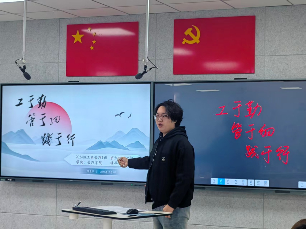 “34名学子同心聚力,6名少数民族同学多元相融,这是一个充满活力与温度的集体!”活动伊始,班长陈景灏以翔实的数据和生动的案例,全面展现了班级的精神风貌与建设成效。他围绕“工于勤,管于细,践于行”的班训,从班级概况、学风建设、集体活动、未来规划四大维度展开介绍,无论是团课班会100%的参与率、11人斩获各类奖学金的亮眼成绩,还是连续两学期荣获“优良班风班”的荣誉加持,都彰显着班级的凝聚力与战斗力。从运动会上的并肩拼搏到志愿服务中的无私奉献,从学习研讨中的思维碰撞到日常生活中的互助友爱,陈景灏的讲述让在场师生真切感受到这个集体“勤学善思、团结奋进”的良好氛围。