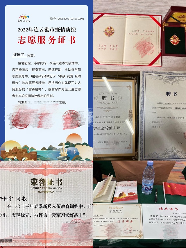 2023年3月,怀着对军营的无限向往,作为应届毕业生的许恒宇毅然放下书本,穿上戎装,开启了为期两年的军旅生涯。服役期间,他肩负新闻报道员的职责,深知这一岗位是军营故事的传声筒、战友风采的展示窗,更是传递军营正能量的重要纽带。为及时记录训练日常、定格战友们的热血瞬间,他保持着高强度的创作节奏——平均每日撰写5篇新闻稿,在部队内网累计发布稿件1500余篇。深夜灯光下打磨文字的执着,训练场上跟随队伍捕捉素材的坚守,字斟句酌核对细节的严谨,构成了他军旅生活的日常。这段经历不仅让他的文字功底与抗压能力得到极致锤炼,更养成了严谨细致高效执行的过硬作风,而这恰好与金融行业精准无误审慎笃行的职业要求不谋而合。凭借在岗位上的突出表现,他先后被总队训练基地评为爱警习武好战士,2024年12月更荣获四有优秀士兵称号并记嘉奖一次。在军营的淬炼中,许恒宇读懂了忠诚的深刻内涵:是坚守岗位的责任,是危难时刻的挺身而出,是全力以赴的担当。这份信念,也成为他后来选择金融学专业的重要指引——金融守护的是国家与人民的经济安全,这份守护的初心,与军营保卫家国的使命一脉相承。奉献的脚步从未停歇。2022年12月,连云港市疫情防控形势严峻,他主动请缨成为志愿者,奔走在核酸检测、物资配送的一线,用汗水筑牢防疫屏障,获评连云港市疫情防控优秀志愿者;2025年3月退伍后,他积极参与连云港市春季自主就业退役士兵适应性培训,以认真负责的态度和出色的组织能力获评优秀班委。从校园到军营,从志愿服务到退役培训,服务他人、奉献社会的信念始终在他心中熠熠生辉。