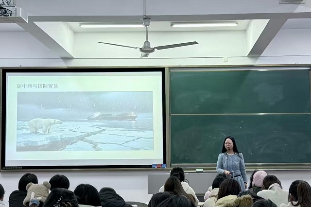 讲座伊始,谢海燕老师围绕“碳中和如何重塑国际贸易规则”“绿色贸易壁垒的新趋势”“我国外贸企业的低碳转型路径”等核心议题展开系统解读。她结合详实的数据与政策案例,剖析了碳中和相关举措对全球产业链、供应链的深远影响,并从学术前沿与产业实践的双重视角,梳理了在“双碳”目标下国际贸易领域涌现的机遇与应对之策。