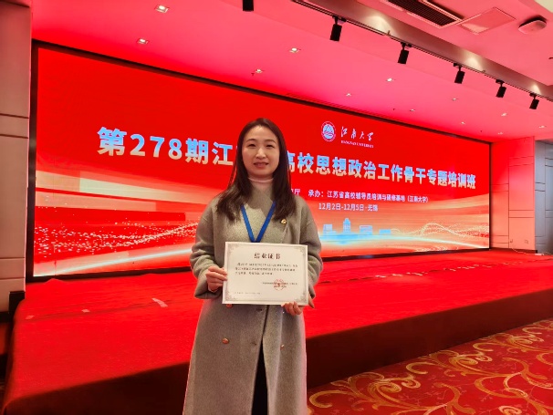 12月3日,第278期江苏省高校思想政治工作骨干专题培训班在江南大学顺利开班,我院辅导员薛玲艳老师参加了此次专题培训。本次培训通过专题学习与实地研学相结合的方式,有效拓宽了辅导员的工作思路,为提升我院大学生生涯教育与就业指导工作质量注入了新动能。
