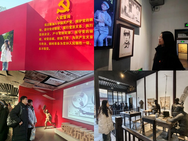 在讲解员的带领下,支部成员们有序参观了“史料展览馆”“将军碑廊”及指挥部旧址等核心展区。一段段文字、一张张图片、一件件实物,立体还原了新四军江南指挥部运筹帷幄、浴血奋战的峥嵘岁月。1939年,指挥部在此成立,陈毅、粟裕等革命家执行“向南巩固、向东作战、向北发展”的战略方针,开创了苏南抗日根据地,为华中抗战大局奠定了关键基础,同学们深切感受到这片土地所承载的战略分量与历史荣光。