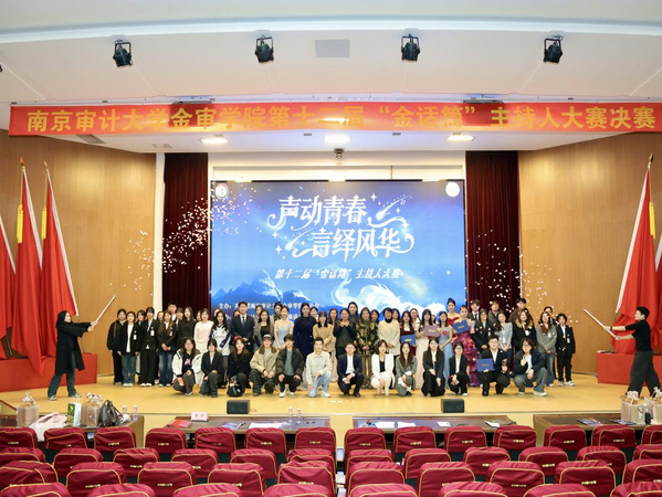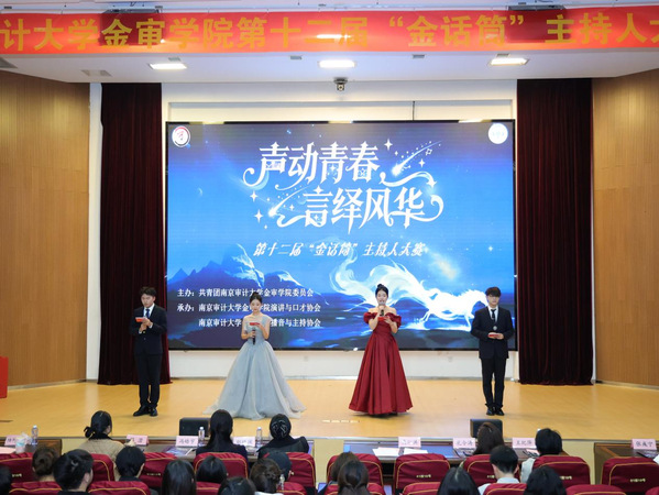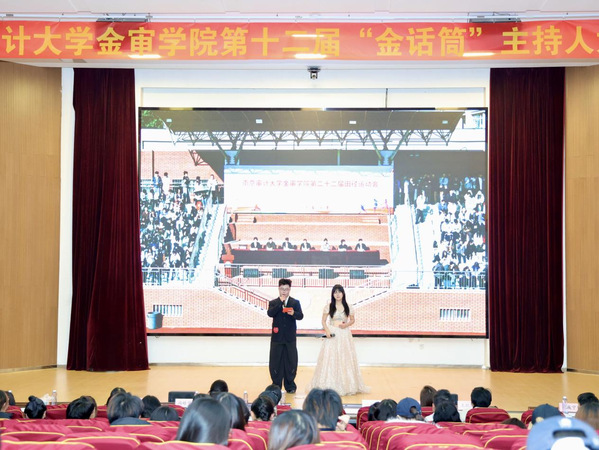 2025年12月10日,南京审计大学金审学院第十二届“金话筒”主持人大赛在图书馆报告厅圆满收官。作为学校连续深耕12年的校园文化品牌,本次大赛由共青团南京审计大学金审学院委员会主办、演讲与口才协会及播音与主持协会承办,管理学院分党总支副书记李丹、校团委副书记冯皓字、校团委老师陈澄、吴沁洪、演讲与口才协会指导老师孔令涛、播音与主特协会指导老师王纪萍以及南京传媒学院演讲与口才协会社长郭晓澜、河海大学水雅演讲社副社长王渌、南京中医药大学杏林之声广播站陆何沄茜等嘉宾莅临指导。