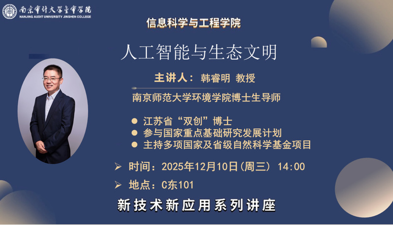2025年12月10日,由信息科学与工程学院主办的“新技术新应用”系列讲座在南京审计大学金审学院C东101成功举办。本次讲座主题为“人工智能与生态文明”,特邀南京师范大学环境学院教授、博士生导师韩睿明担任主讲,旨在探讨如何借助人工智能技术推进生态文明建设,为可持续发展提供新思路与解决方案。