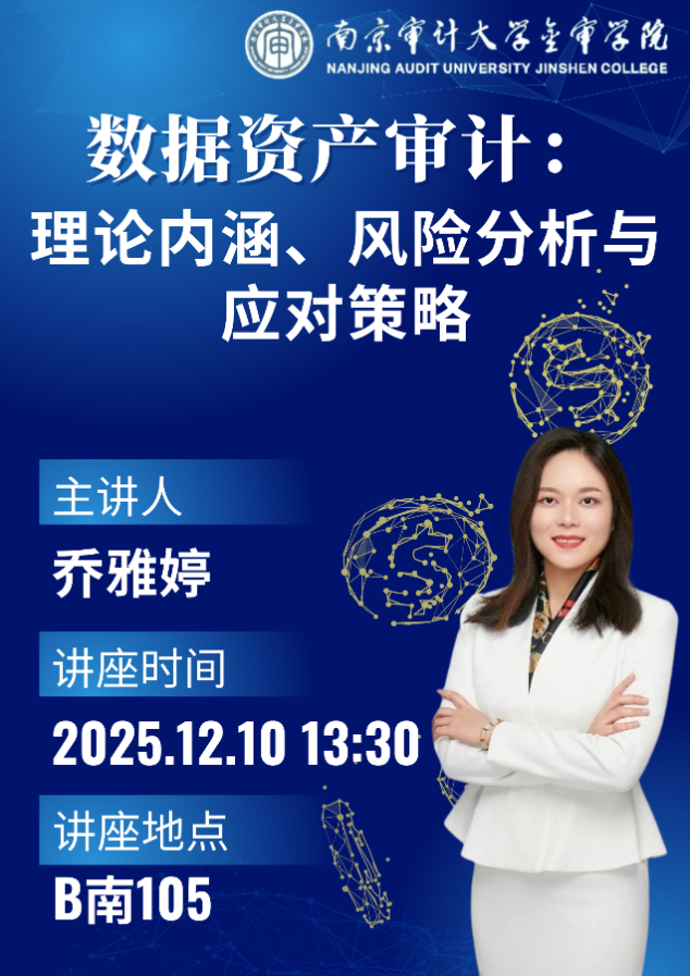 为深化师生对数字经济背景下审计领域新课题的认知,2025年12月10日,主题为“数据资产审计:理论内涵、风险分析与应对策略”的专题讲成功举办。本次讲座由乔雅婷老师主讲,审计学等相关专业的师生参与讲座,共同探究数据资产审计领域的前沿问题与实践路径。