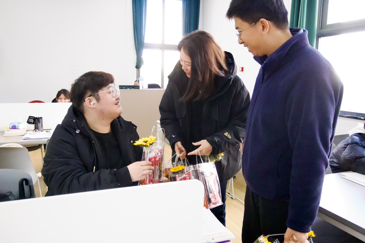 在图书馆的书咖区域,学院老师与备考学子亲切交谈,细细叮嘱大家合理安排作息、保持良好心态;自习室里,老师们轻手轻脚为埋头刷题的学子递上福袋,轻声道一句“加油”;教学楼的走廊与窗边,师生手持福袋合影,镜头里的笑容格外温暖。此次准备的福袋颇具巧思,除了“成功上岸”主题文具套装、励志祝福卡片,还搭配了向日葵花束、橙子等寓意“一举夺魁”“心想事成”的礼物,每一份都藏着审计学院对学子的殷切期盼。