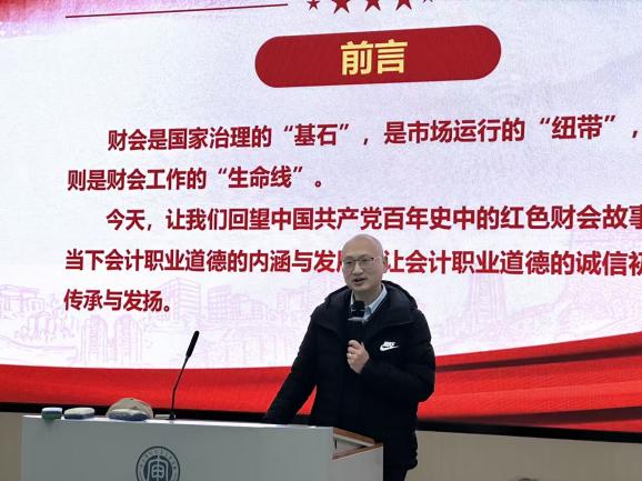 邓德强教授以红色金融发展史为主线,系统梳理了从革命时期到新时代财会行业“诚信为本”的精神传承脉络。他结合经典案例深入剖析,阐明了财会诚信与职业道德在行业发展中的核心地位;同时立足自身研究与实践经验,精准解读当前财会行业面临的伦理挑战,为在场学子清晰划定了职业道路上的道德准则与行为边界。
