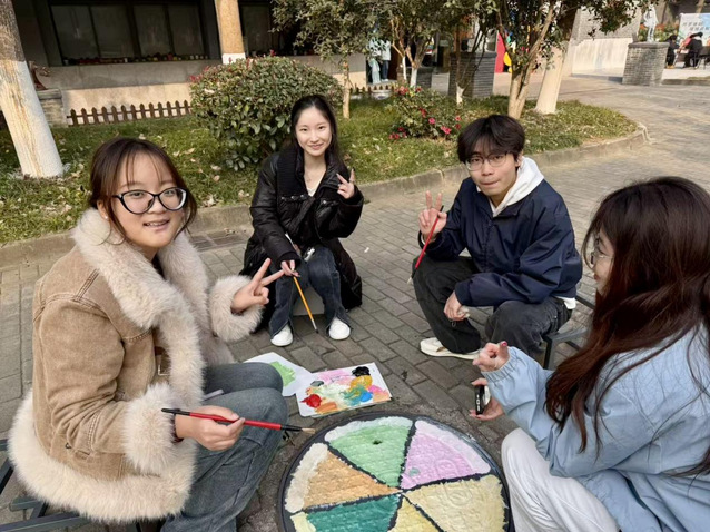 原本单调冰冷的井盖,在同学们的奇思妙想与巧手绘制下,摇身一变成为一个个独具特色的“地面艺术品”。路过的师生纷纷驻足观赏、由衷赞叹,不少同学拿出手机拍照留念,记录下这抹校园亮色。甚至有其他学院的学生被现场氛围感染,主动提出加入创作,与艺术设计学院的学子一同调色、涂鸦,活动现场始终洋溢着欢声笑语与创作热情。