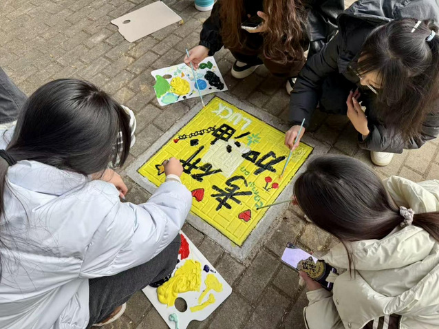 活动现场热闹非凡,同学们以小组为单位,提前备好颜料、画笔、调色盘等工具,准时抵达指定区域集合。围绕井盖展开热烈讨论,从主题构思到色彩搭配,从线条勾勒到细节填充,每一个环节都反复斟酌、精益求精。