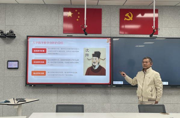 随后,卢殿臣教授聚焦核心议题,强调教学创新既是提升课堂教学质量的核心引擎,更是教学竞赛中彰显竞争力的关键评分维度。研讨中,他明确了大学数学教学创新的三大实践路径:在内容创新层面,需引入贴近生活实际与专业场景的案例,有机融入课程思政元素,让抽象的数学知识具象化、生活化;在方法创新层面,应积极推广案例教学法,深化线上线下混合式教学模式应用,有效激活课堂教学活力;在评价创新层面,要强化过程性评价,优化多元考核方式,实现对学生学习成效的全面、精准衡量。此外,卢教授还分享了江苏大学的教学改革实践经验,为参会教师提供了宝贵的借鉴范式。