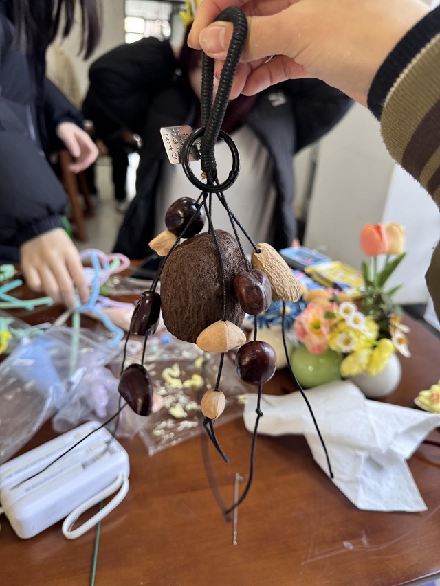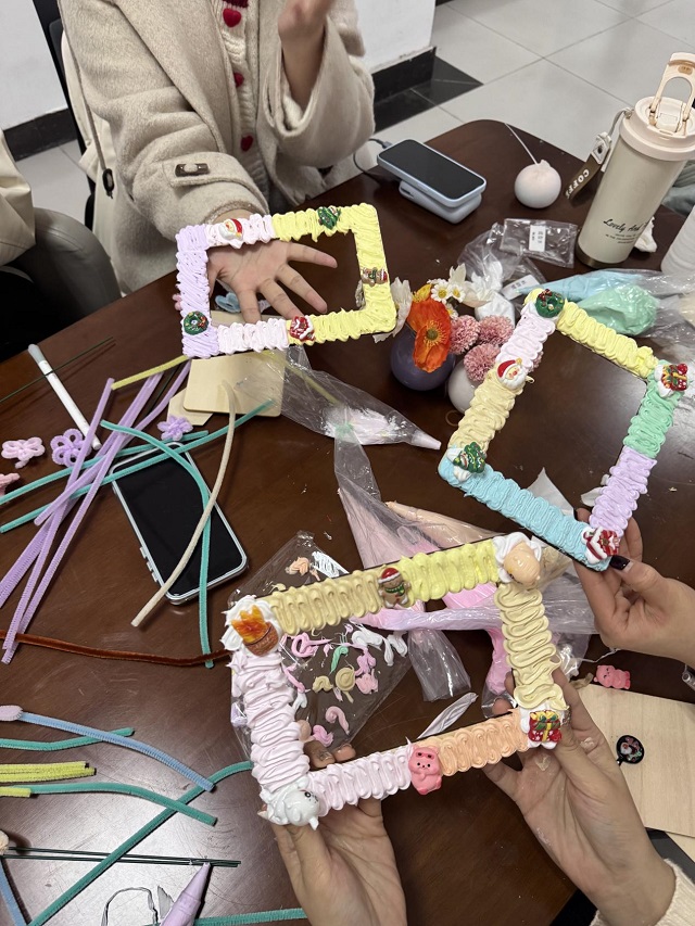 活动现场摆放着奶油胶、相框、扭扭棒、丙烯颜料、果壳、风铃挂饰等丰富材料,同学们分组投入到创作中。制作奶油胶相框时,大家精心挑选配饰,将童趣与创意融入方寸相框;圣诞扭扭棒创作环节,红绿色的扭扭棒在指尖缠绕,化作圣诞树、麋鹿、铃铛等可爱的圣诞元素;肌理画创作区,同学们用刮刀调和颜料,在画板上勾勒出富有层次感的纹理与图案;果壳风铃制作组则将核桃壳、开心果壳等精心打磨、串连,搭配彩绳与铃铛,制作出独一无二的自然系风铃。现场欢声笑语不断,同学们互相交流创作思路,彼此分享灵感,氛围轻松又温馨。