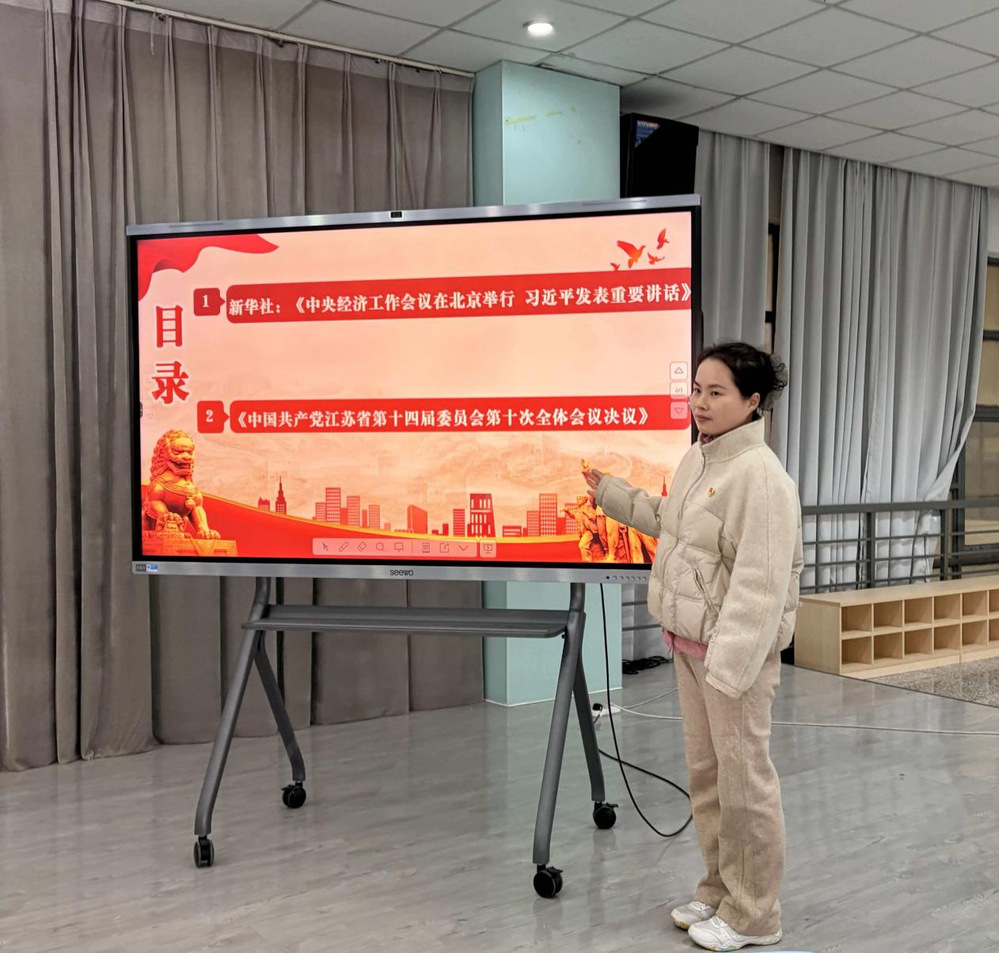 本次学习聚焦《中央经济工作会议在北京举行习近平发表重要讲话》与《中国共产党江苏省第十四届委员会第十次全体会议决议》两份核心材料。会上,党员教师依次领读原文段落,通过“读、听、思”相结合的方式,原原本本、逐字逐句学习领会中央精神与省委部署,现场学习氛围庄重而热烈。