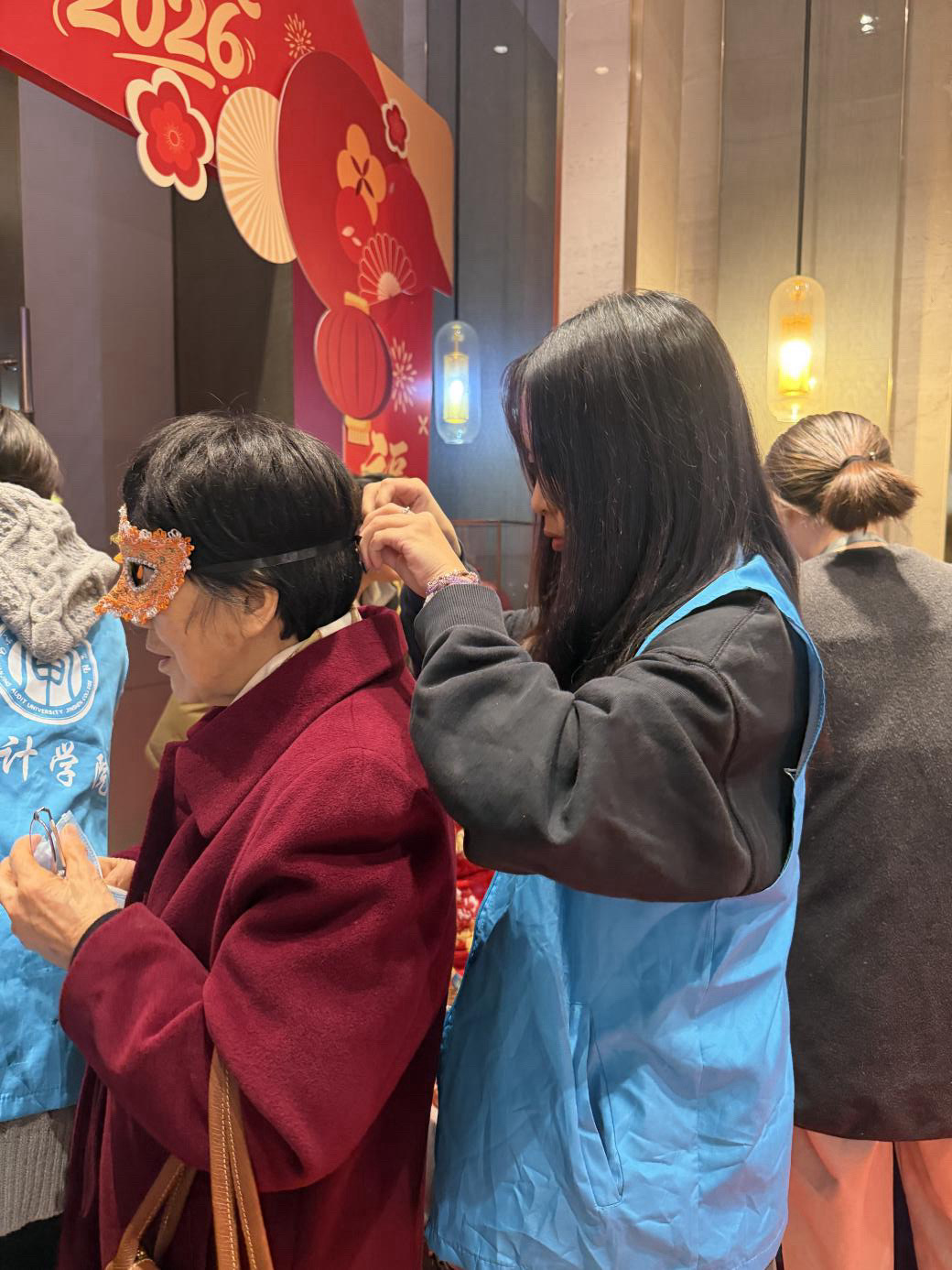 活动现场处处暖意融融,审计学院志愿者们化身暖心使者,一边温柔引导长者有序签到,一边细心协助发放号码牌、为长辈们佩戴上喜庆的节日面具,一举一动皆饱含诚意,一言一行尽显贴心,以周全细致的服务为活动筑牢保障、保驾护航,浓郁的喜庆气息与祥和氛围悄然弥漫在社区的各个角落,满溢温情与暖意。