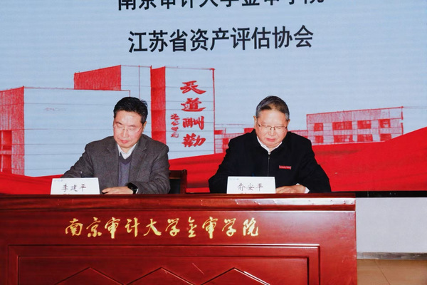 为深化产教融合、促进“校-企-协”三方联动,实现协同育新人,2026年1月5日下午,南京审计大学金审学院在图书馆报告厅隆重举行了 “校协”“校企”合作签约仪式暨资产评估专业建设研讨会。来自江苏省资产评估协会、多家知名资产评估机构、兄弟院校及企业界的专家学者、行业精英与学院师生代表齐聚一堂,共话资产评估专业人才培养与行业发展新路径。