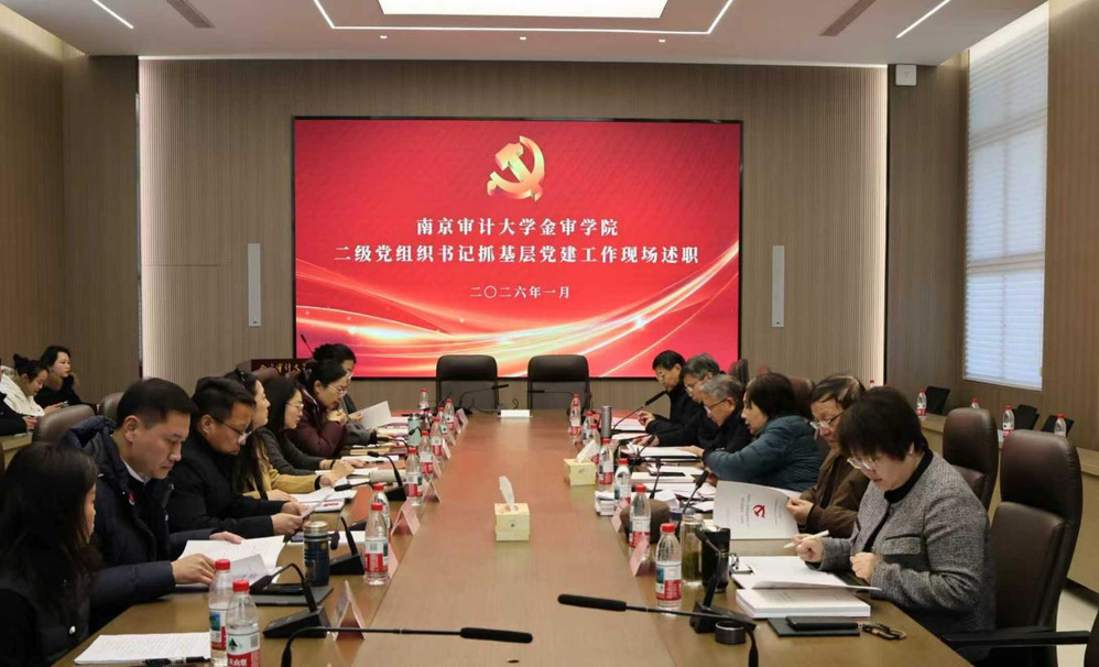 王军作总结点评,对各党总支、直属党支部书记2025年度抓基层党建工作成效表示充分肯定。回顾2025年工作,他讲到,在南京审计大学党委的坚强领导下,学校构建并持续完善“五三四五”党建工作体系,党组织政治核心作用有效发挥,党建标志性成果持续显现,全面从严治党工作纵深推进。他强调,2025年学校党建工作成效显著,但是在深化党建工作顶层设计、增强高等级成果示范辐射效应、强化基层党建品牌建设等方面仍需进一步努力,他号召各党总支、直属党支部书记以此次述职评议为新起点,进一步强化责任担当、提升履职能力,以述促改、以评促建、以责促干,以更加昂扬的精神状态、更加务实的工作作风,奋力谱写学校党建工作新篇章,为推动学校事业高质量发展提供坚强政治保障。