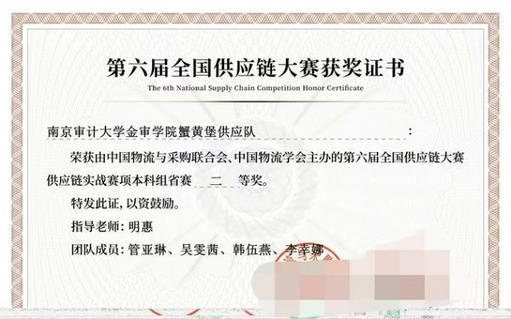 在创新创业竞赛赛场,她同样锐意进取、屡获佳绩。2024年9月,斩获第十八届全国高校商业精英挑战赛文旅与会展创新创业实践竞赛江苏省二等奖;同年10月,带领团队在“百蝶杯”第十届全国大学生物流仿真设计大赛智慧仓赛道中脱颖而出,获国赛二等奖。2025年,她的竞赛之路更是硕果累累:5月,获第六届全国供应链大赛本科组省赛二等奖;6月,带领团队拿下2025iCAN大学生创新创业大赛“鼎航杯”数字化创业经营模拟挑战赛省赛一等奖;10月,在该赛事国赛中再创佳绩,获国赛三等奖;同期,她参与的作品入选第八届全国大学生网络文化节-光影趣青春推荐名单,获江苏省高校网络政治工作中心认可,用一项项沉甸甸的荣誉证明了自己的综合实力。
