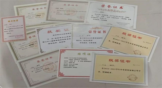 他始终牢记学业是根本,在深入钻研中取得了丰富成果。在学科竞赛中表现出色,先后荣获南京审计大学金审学院第三届高等数学竞赛一等奖,连续两年获得江苏省高等数学竞赛本科二级组三等奖;获得第十一届“东方财富杯”全国大学生金融挑战赛一等奖,两次获得江苏省教育厅颁发的国家励志奖学金,连续两年获得校级三等奖学金,以稳定的学业成绩为大学成长打下坚实基础。