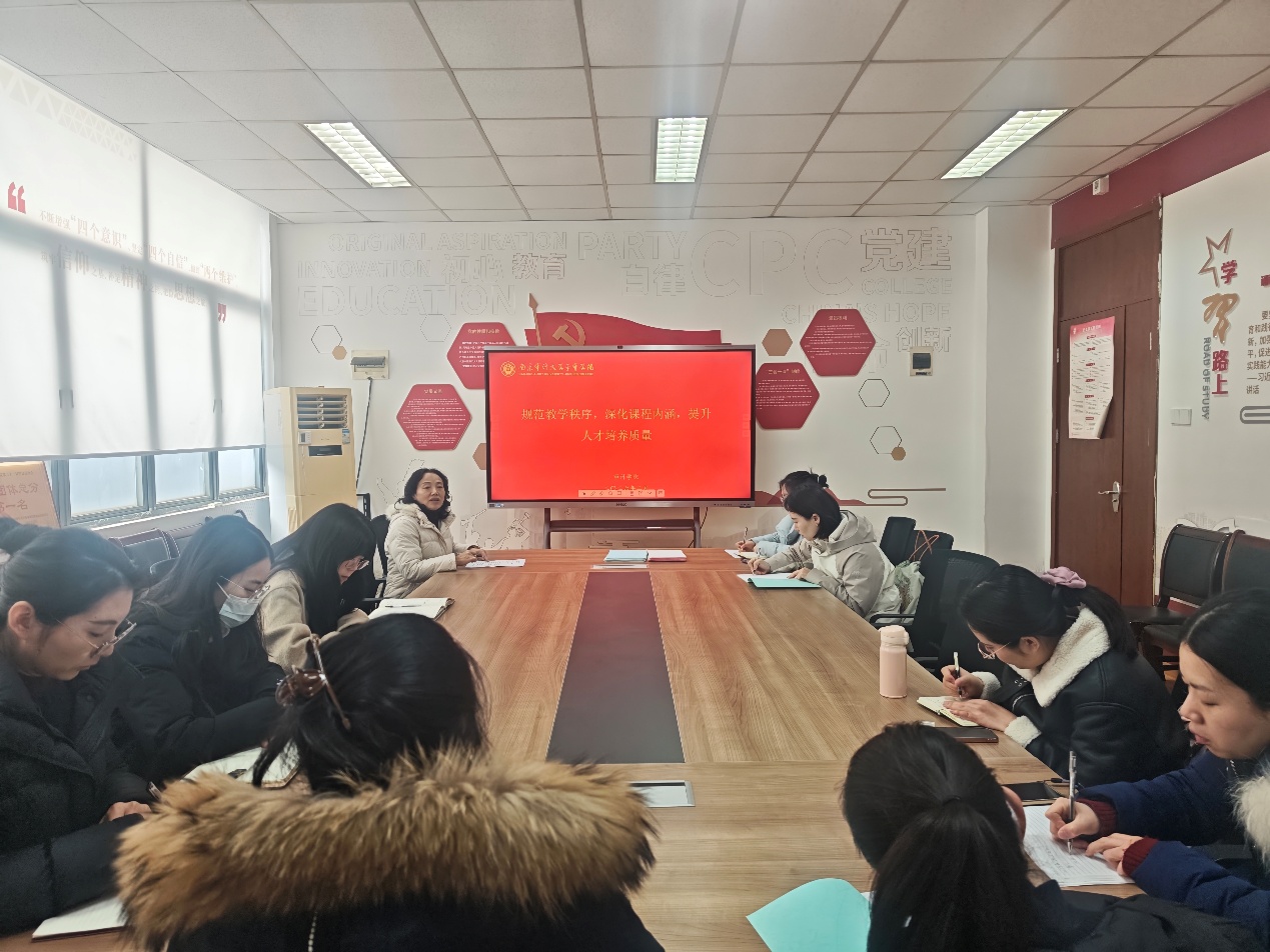 接着,和秀星副院长对新学期教学任务做出具体部署:她鼓励教师细致做好课前准备,认真核对课表、完善教学材料,以饱满状态迎接开学第一周,展现良好教学风貌。同时,她带领全体教师深入学习教务处〔2026〕15号文件精神,并强调,要以规范管理为抓手,以严谨治学为保障,持续优化课堂纪律、作业考核及试卷命题质量,营造严谨高效的教学氛围,助力新学期教学工作稳步推进。