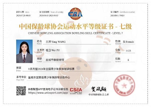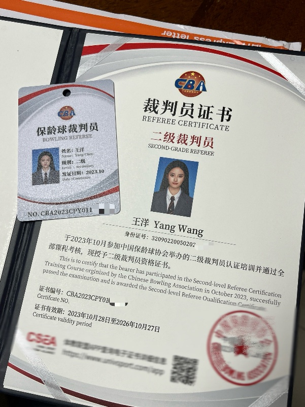 在紧张的训练与激烈的赛事之余,她始终坚持深耕专业、不断自我提升,顺利考取国家二级保龄球裁判员证书与国家保龄球初级教练员资格证。这些专业资质,既是对她综合能力与专业素养的权威认可,也为她今后在保龄球领域实现多元发展、拓宽职业道路筑牢了坚实基础。